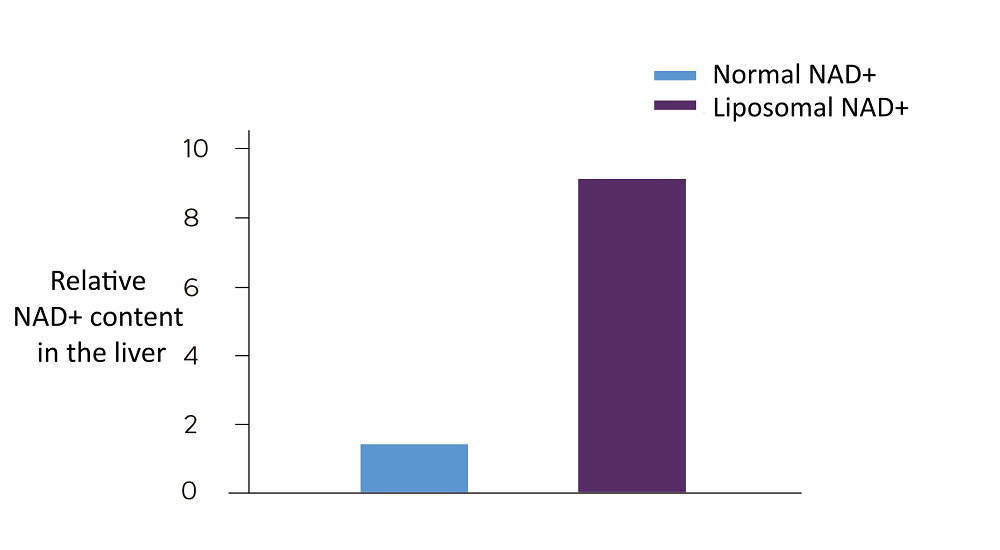 동물 연구에 따르면 리포솜 NAD+는 간의 상대적 NAD+ 함량을 약 9배 증가시키는 것으로 나타났습니다.