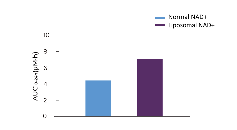 인체 임상 실험 결과, 리포좀형 NAD+는 인체 내 NAD+의 생물학적 이용가능성을 약 1.52배 증가시키는 것으로 나타났습니다.